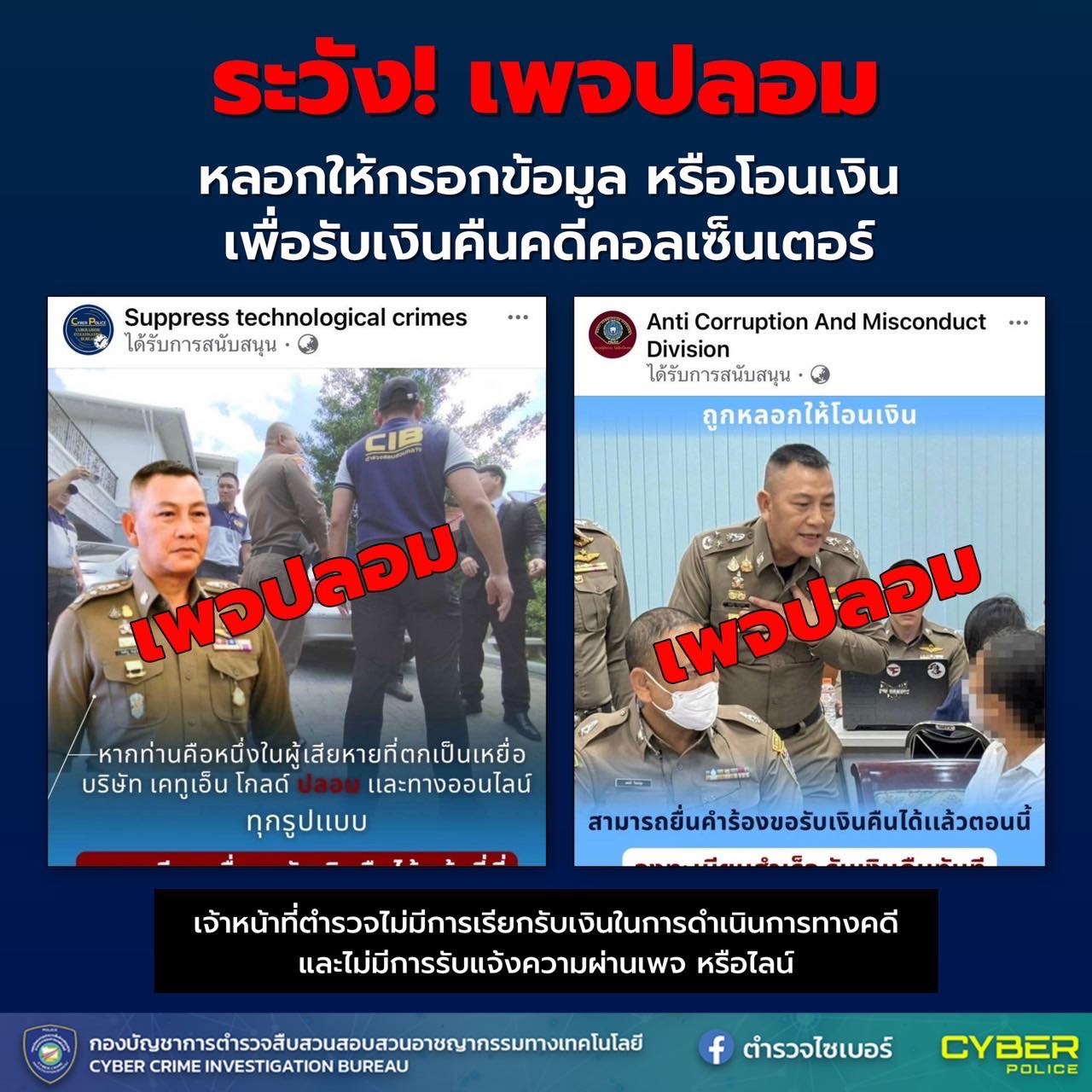 ระวังเพจปลอมหลอกให้กรอกข้อมูล หรือหลอกให้โอนเงินก่อน เพื่อขอรับเงินคืนในคดีแก๊งคอลเซ็นเตอร์ โดยแอบอ้างภาพ ผบ.ตร. หรือนายตำรวจระดับสูง